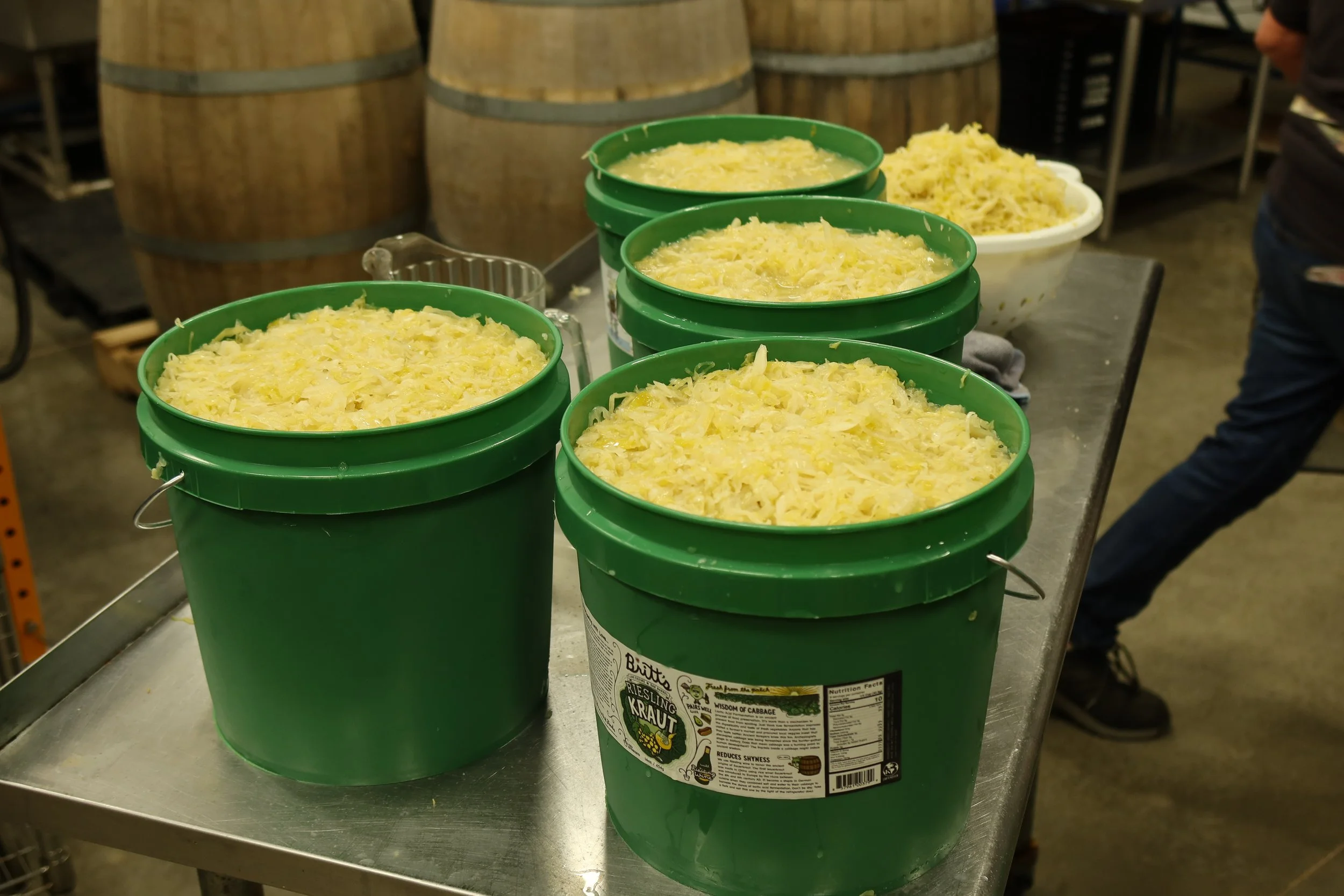 Britt’s Pickle Factory is small but mighty! Immediately upon entering you are greeted with the bustle of the team of employees working to make pickles, kraut, and kimchi, or packaging them up for sale at the farmer’s market or to ship out to their grocery locations. The air is tart with the smell of cucumber, garlic, and pepper. The oak barrels add a slight woody scent to the air too. Throughout a tour of the factory, you’ll see towering shelves all the way to the ceiling with cardboard boxes, labels, and lots and lots of oak barrels. While there, the small team could be beginning the pickling process, packaging their products, or moving product around. If you are lucky, they might let you into the work space where someone could be working on refurbishing their recycled wine barrels to prepare them for use for pickles. Head back into the factory for a sample of some Peace Pickles and Fire Kraut where your taste buds will buzz with the fizzy probiotics and garlic.