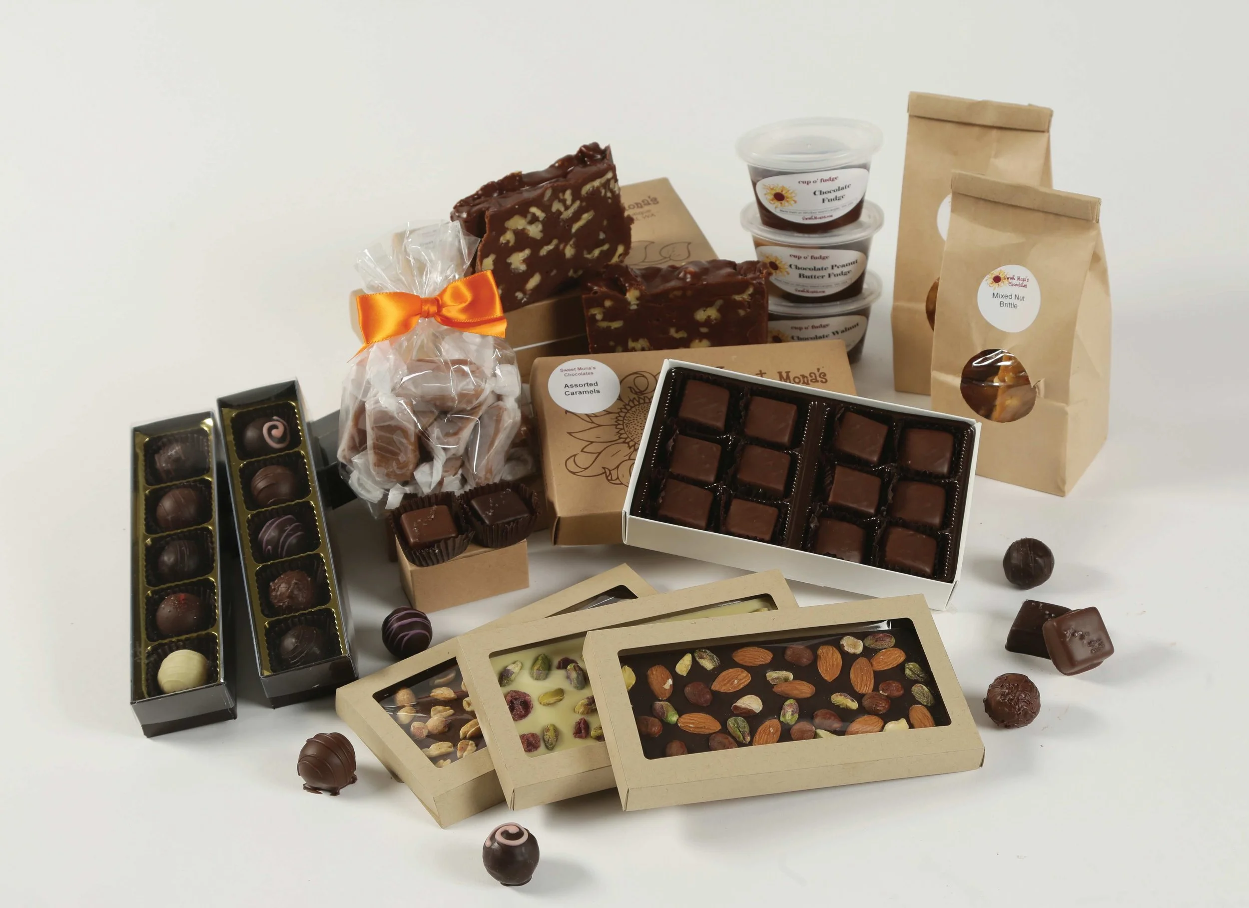 Chocolate covered almonds, chocolate covered caramels, smooth rich fudge, old fashioned nut brittles, old fashioned caramels, and chocolate bars!