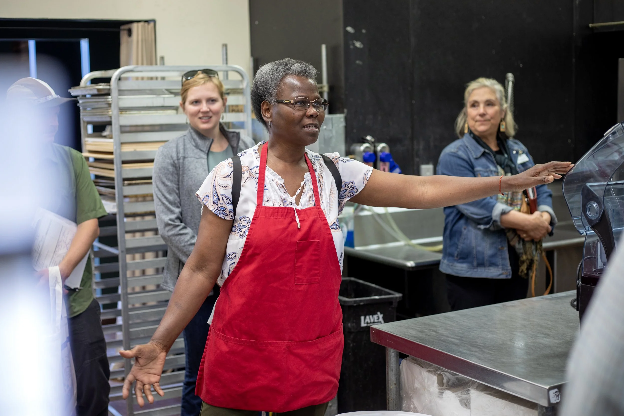 It wasn’t easy to drag the group away from the sunny garden and homemade pizza, but the tour still had many stops to go. Next was Lesedi Farm’s commercial kitchen on Crawford Road. Lesedi Farm has fields where they grow beans, peppers, and other crops for their processed food products like hot sauces, hummus, pesto, cooked greens, samosas, and curries. In a separate commercial kitchen, they process, cook, and package their products for sale at farmer’s markets, events, stores, and on the WIGC Food Hub.